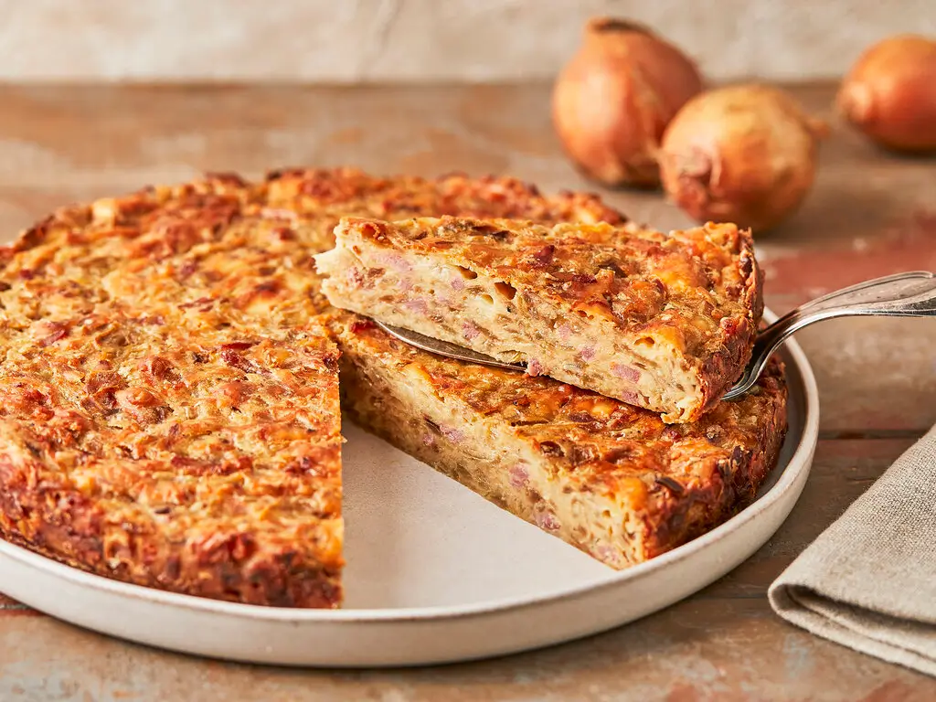 Den Belag dann in die mit dem Teig ausgelegte Kuchenform geben und anschließend noch mit dem geräucherten Schinken und dem Kümmel bestreuen. Abschließend noch einige Butterflocken darauf geben.
